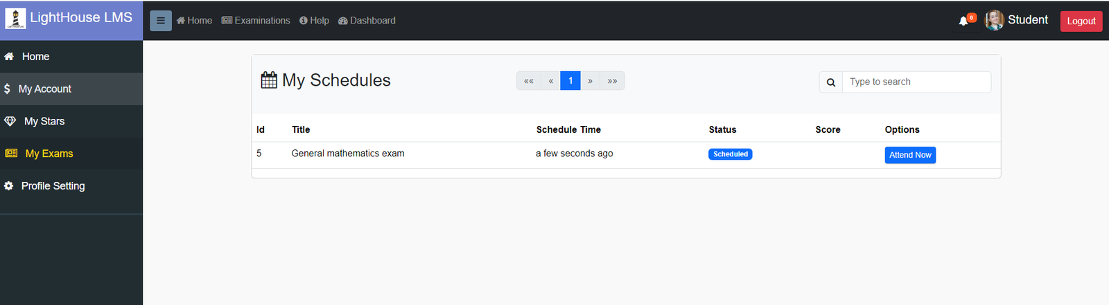 As a student, you can attend exams by clicking the "Attend Exam" button displayed next to each exam in the dashboard, as shown below.