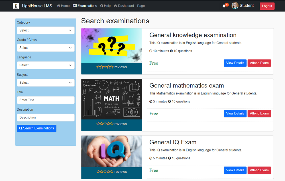 You can find all available exams with an "Attend Exam" button next to each one. If the exam is not free, ensure you have enough credits in your account before proceeding.
